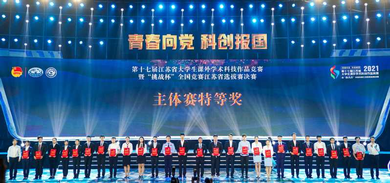 5月15日,第十七屆江蘇省大學生課外學術科技作品競賽暨“挑戰杯”全國競賽江蘇省選拔賽決賽在南京中醫藥大學落下帷幕。學校10件參賽作品全部入圍終審決賽,經過激烈角逐,5件作品獲特等獎,3件作品獲一等獎,2件作品獲二等獎,以團體總分第一名的成績首次捧得賽事唯一最高榮譽“挑戰杯”,取得重大突破。