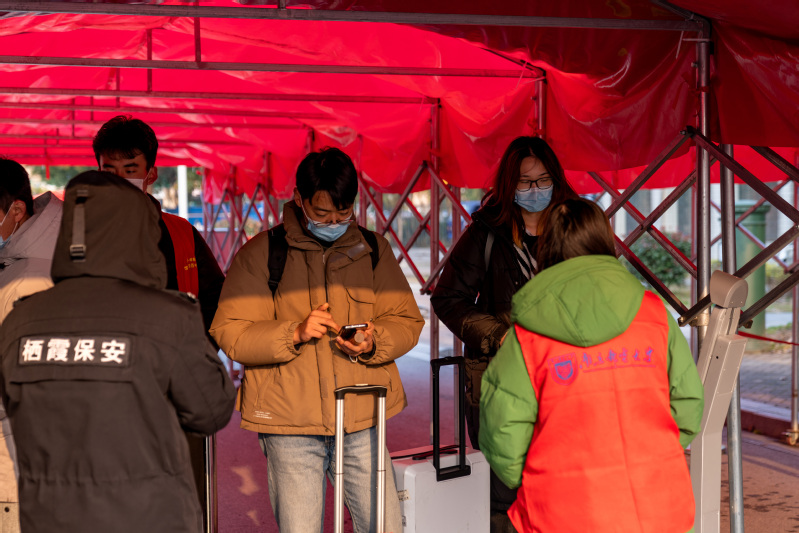 19日清晨,黨委辦公室、校長辦公室,學生工作處,研究生工作部,保衛處,后勤管理處,信息化建設與管理辦公室等相關部門的負責人和工作人員早早就位,熱情迎接返校學子。學校在校門口設置多條進校通道迎接學生入校,返校學生在師生志愿者和安保人員的細心引導下,有序進行刷臉核驗,蘇康碼、行程碼、48小時內核酸檢測陰性證明查驗,體溫檢測后進入校園,隨后返校學生到學校設置的核酸檢測點進行核酸檢測,整個流程有條不紊、井然有序,各個環節銜接緊密、協同高效。