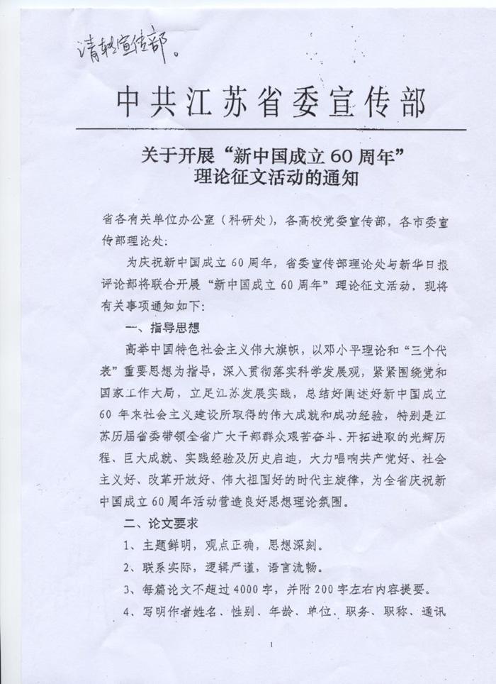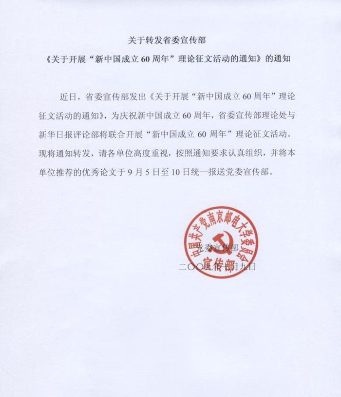 關于轉發省委宣傳部《關于開展“新中國成立60周年”理論征文活動的通知》的通知