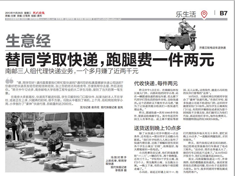 【現代快報】替同學取快遞,跑腿費一件兩元