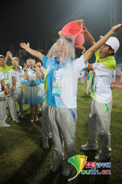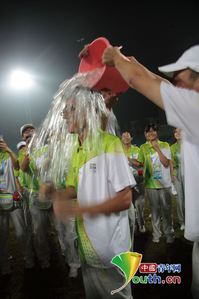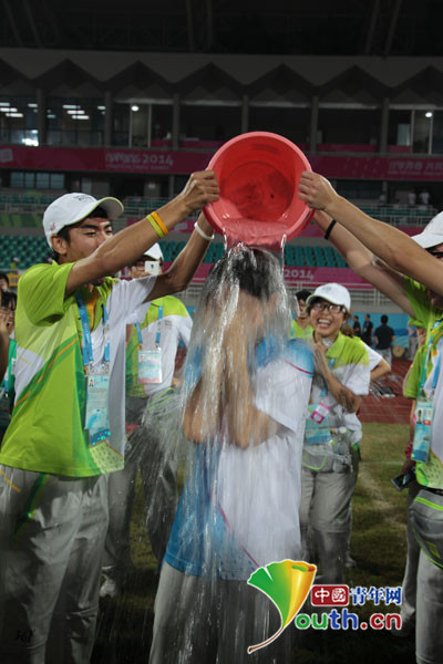 中國青年網南京8月27日電 昨日,南京郵電大學的“小青檸”圓滿完成南京青奧會期間的志愿者任務,在告別儀式上,快樂的小青檸們多次上演冰桶挑戰。