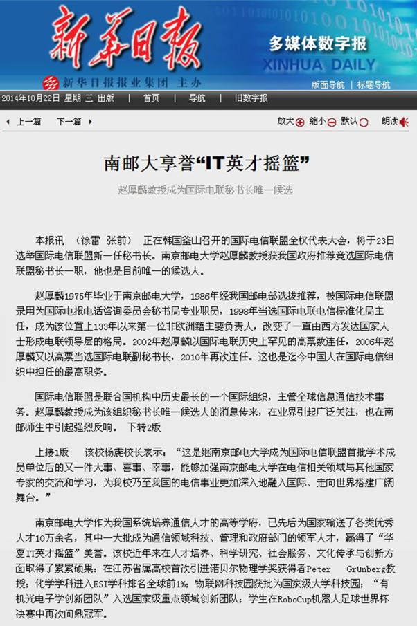 【新華日報】趙厚麟教授成為國際電聯(lián)秘書長唯一候選