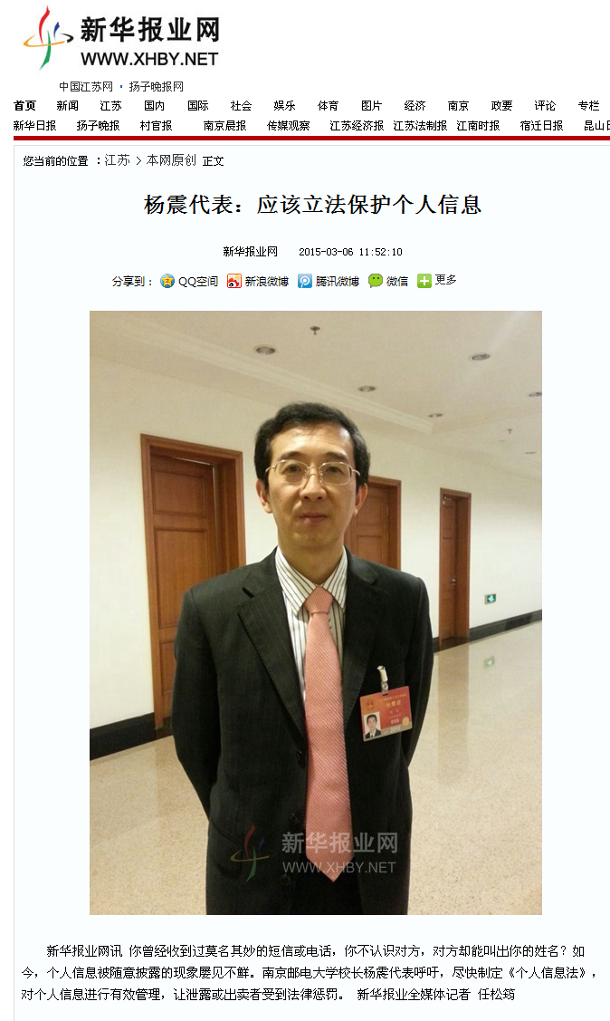 【新華報業(yè)網(wǎng)】楊震代表:應(yīng)該立法保護個人信息