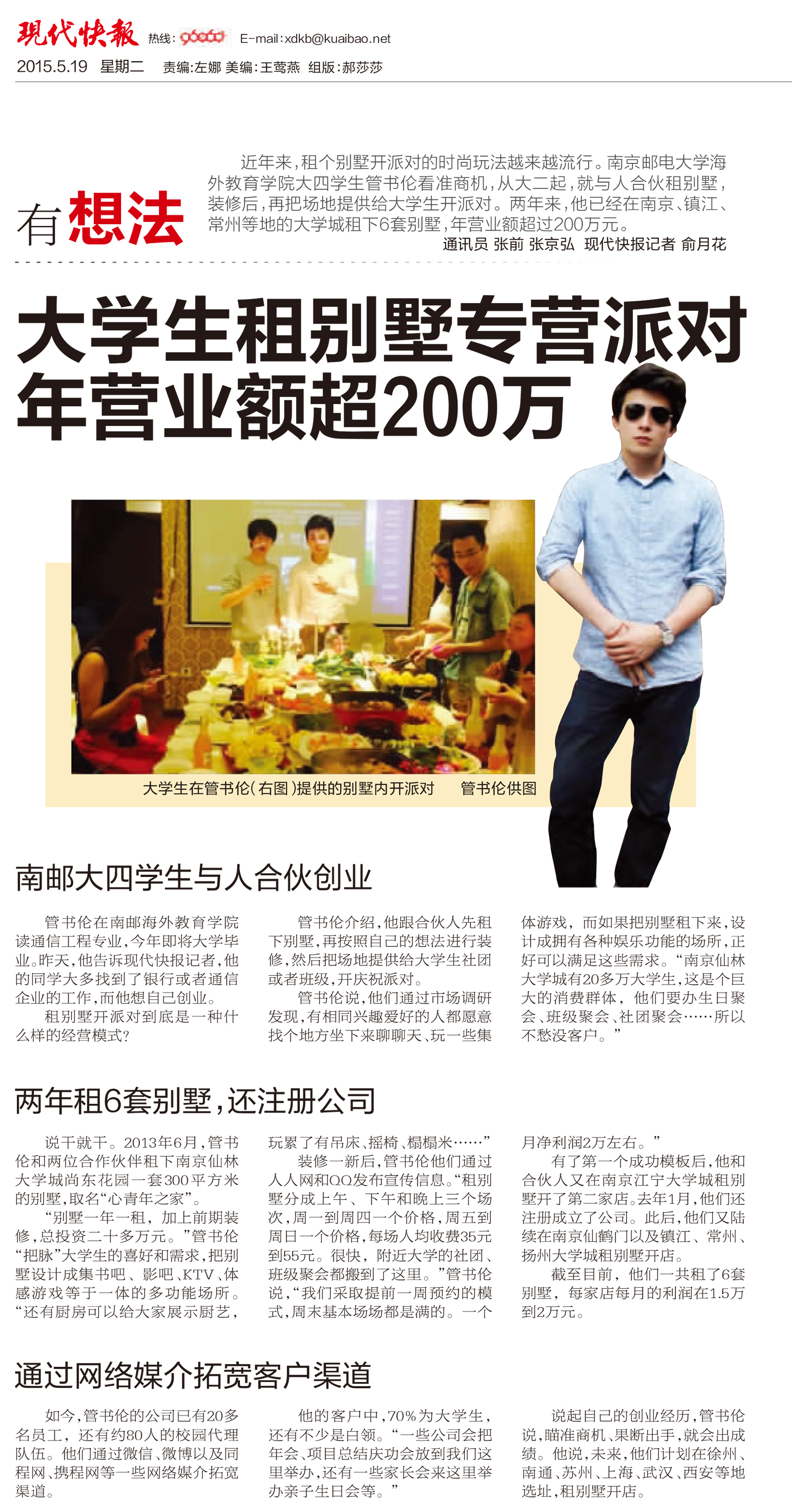 【現(xiàn)代快報】大學生租別墅專營派對年營業(yè)額超200萬