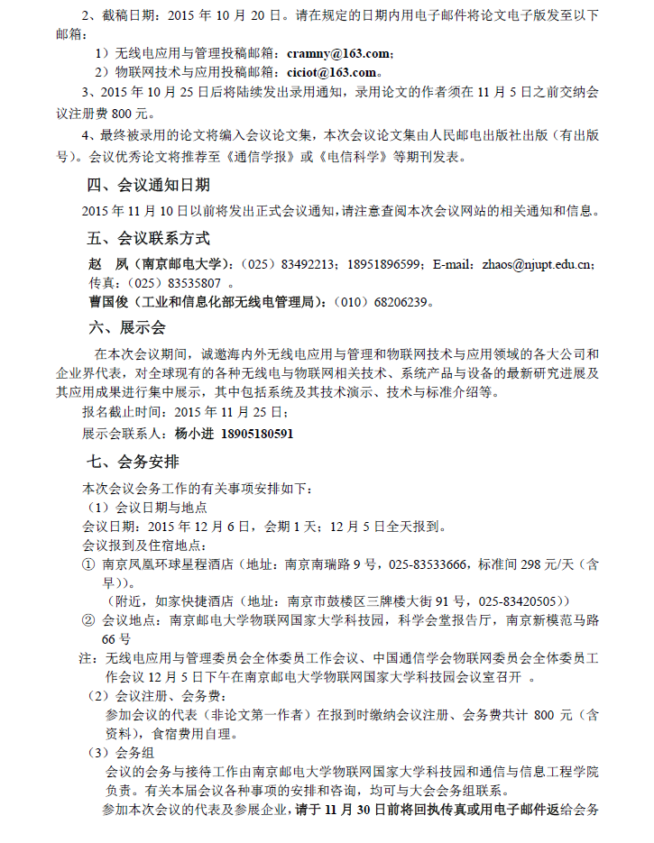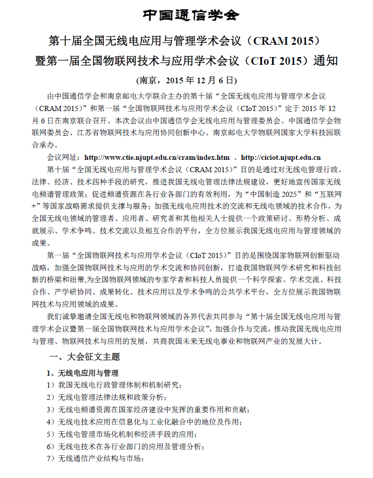 第十屆全國無線電應用與管理學術會議(CRAM 2015)暨第一屆全國物聯網技術與應用學術會議(CIoT 2015)通知