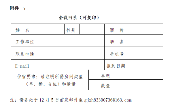 2.為了更好的安排會務,請各位代表按照附件要求填寫會議回執,務必于12月5日前發郵件至我會秘書處,沒有回執的不能保證安排入住諾富特酒店。