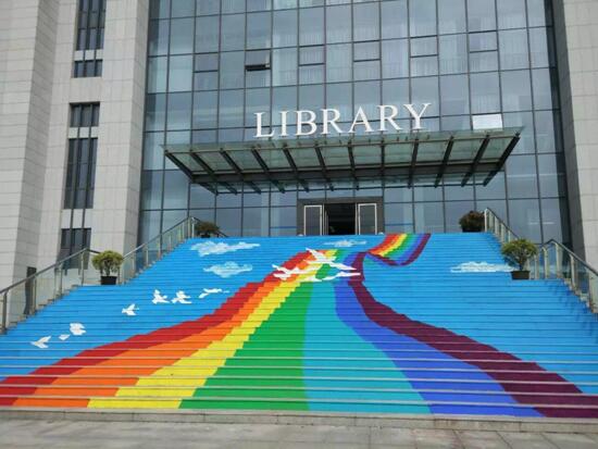 參與此次繪制活動的張偉娜同學介紹說:“這么大的幅面,我們畫了兩天,先用丙烯顏料畫,耐得住風吹日曬,然后再噴層清漆,防止大雨沖洗。因為是畫在臺階的側面,所以從臺階下仰視,就呈現出了立體效果。”路過的同學,無不被這震撼的立體視圖特效深深吸引,“工科大學也越來越生動了!”、“通向知識殿堂的圖書館樓梯,被彩繪得這么好看,這下更有學習的動力了。”巨幅的彩繪,引得不少同學駐足拍照。