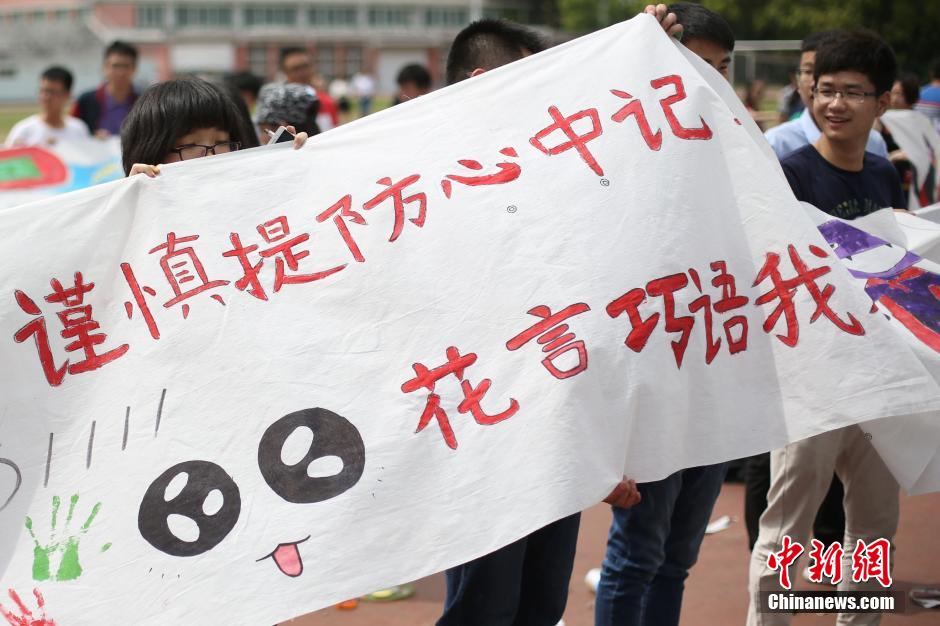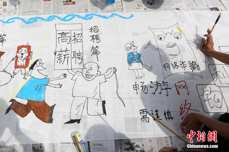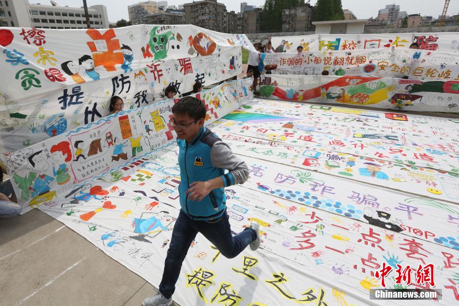 4月22日,以“防詐騙”為主題的手繪公開課在南京郵電大學三牌樓校區操場上舉行,來自管理學院的600名大一學生一起拿起畫筆,在畫布上繪制“詐騙的小船說來就來”、“親,你可長點心吧!”、“千里之外不見面,提防網絡把你騙”、“招聘廣告莫輕信,天上不會掉餡餅”等朗朗上口、過目不易忘的語句,同時配上五彩顏色的漫畫,用寓教于樂的方式增強大學生們的安全意識。中新社記者 泱波 攝