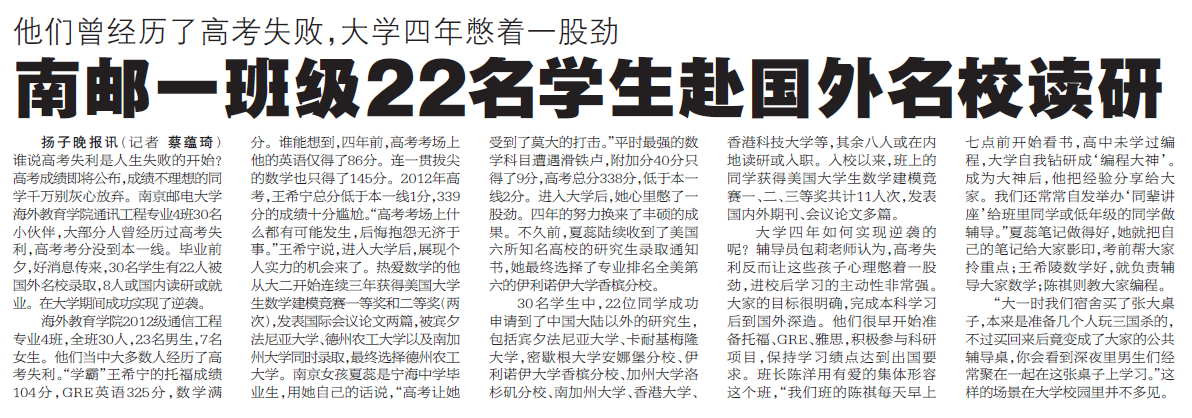 【揚子晚報】南郵一班級22名學生赴國外名校讀研