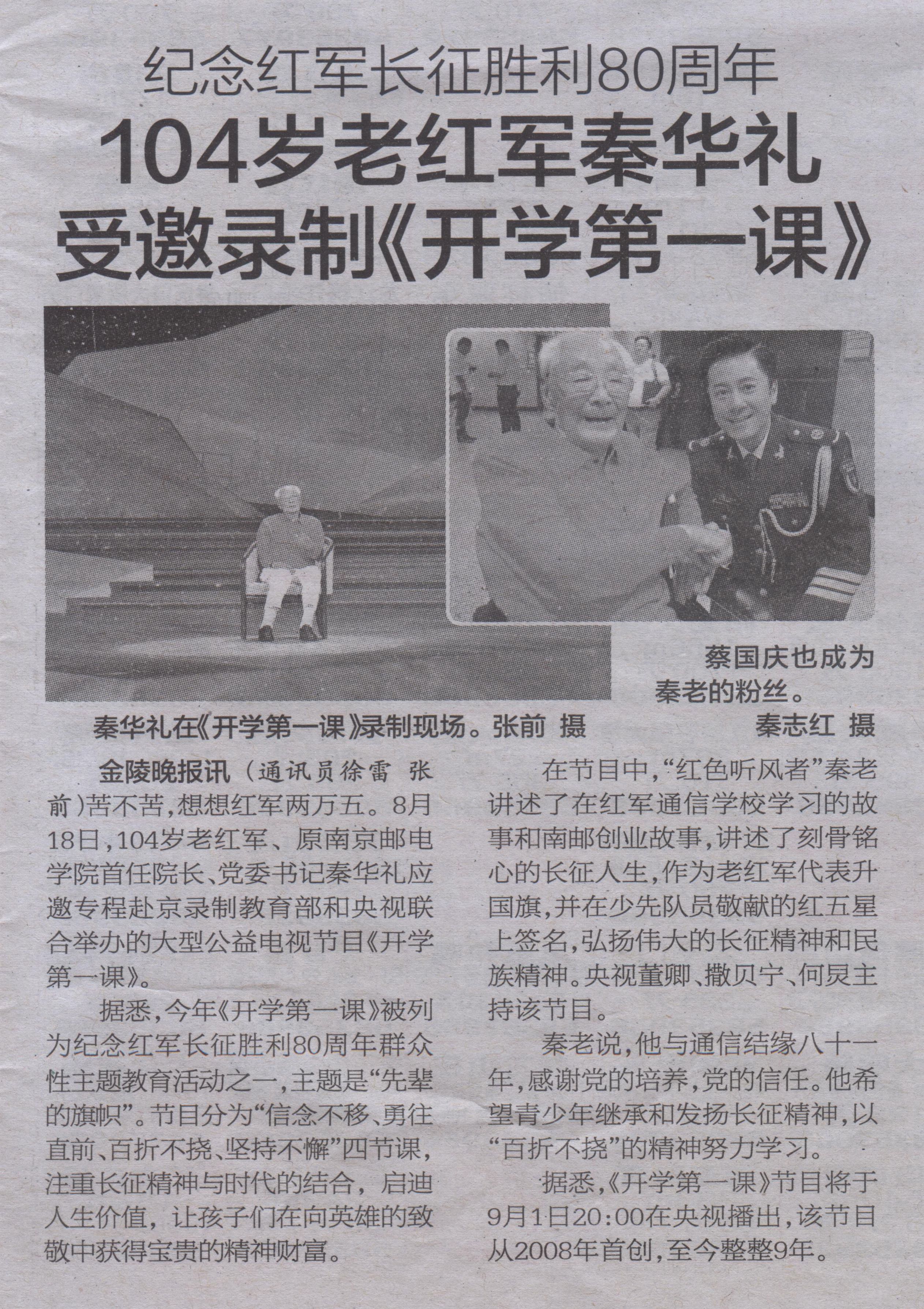 【金陵晚報】104歲老紅軍秦華禮受邀錄制《開學第一課》