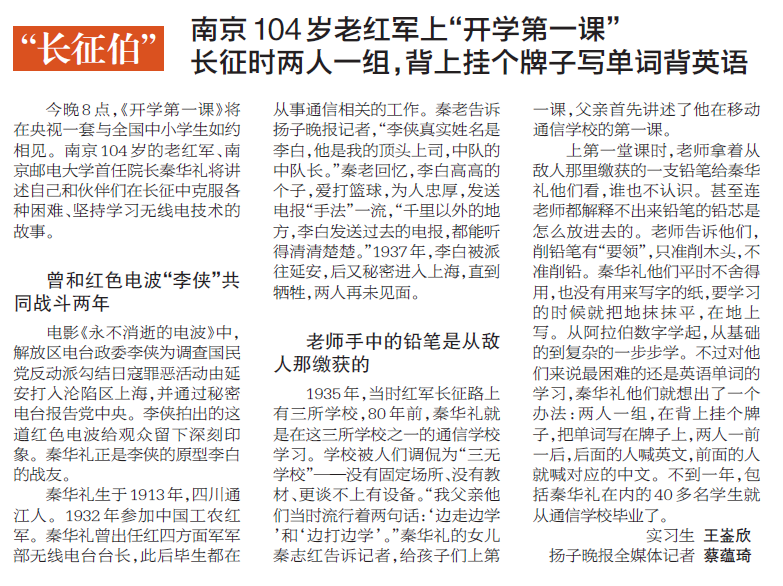 【揚子晚報】南京104歲老紅軍上“開學第一課” 今晚,聽聽他長征中的烽火求學路