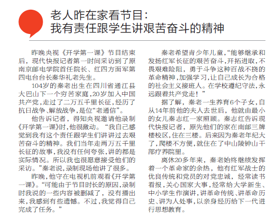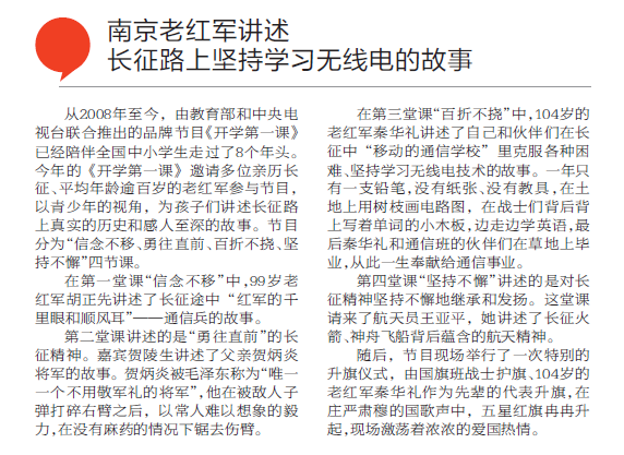 【現(xiàn)代快報(bào)】央視“開(kāi)學(xué)第一課”講長(zhǎng)征故事 南京104歲老紅軍現(xiàn)場(chǎng)升國(guó)旗