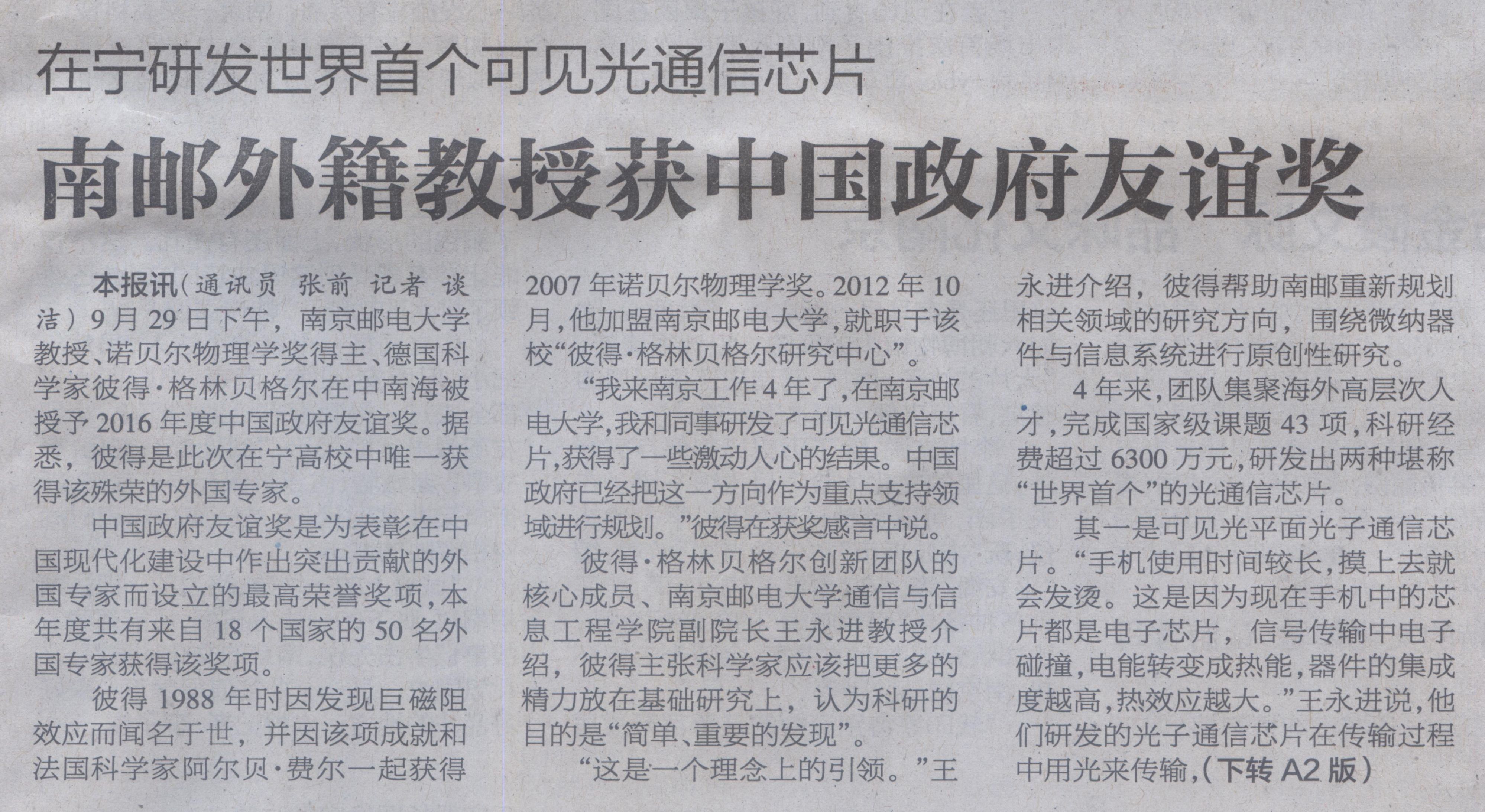 【南京日報(bào)】南郵外籍教授獲中國政府友誼獎(jiǎng)(頭版)