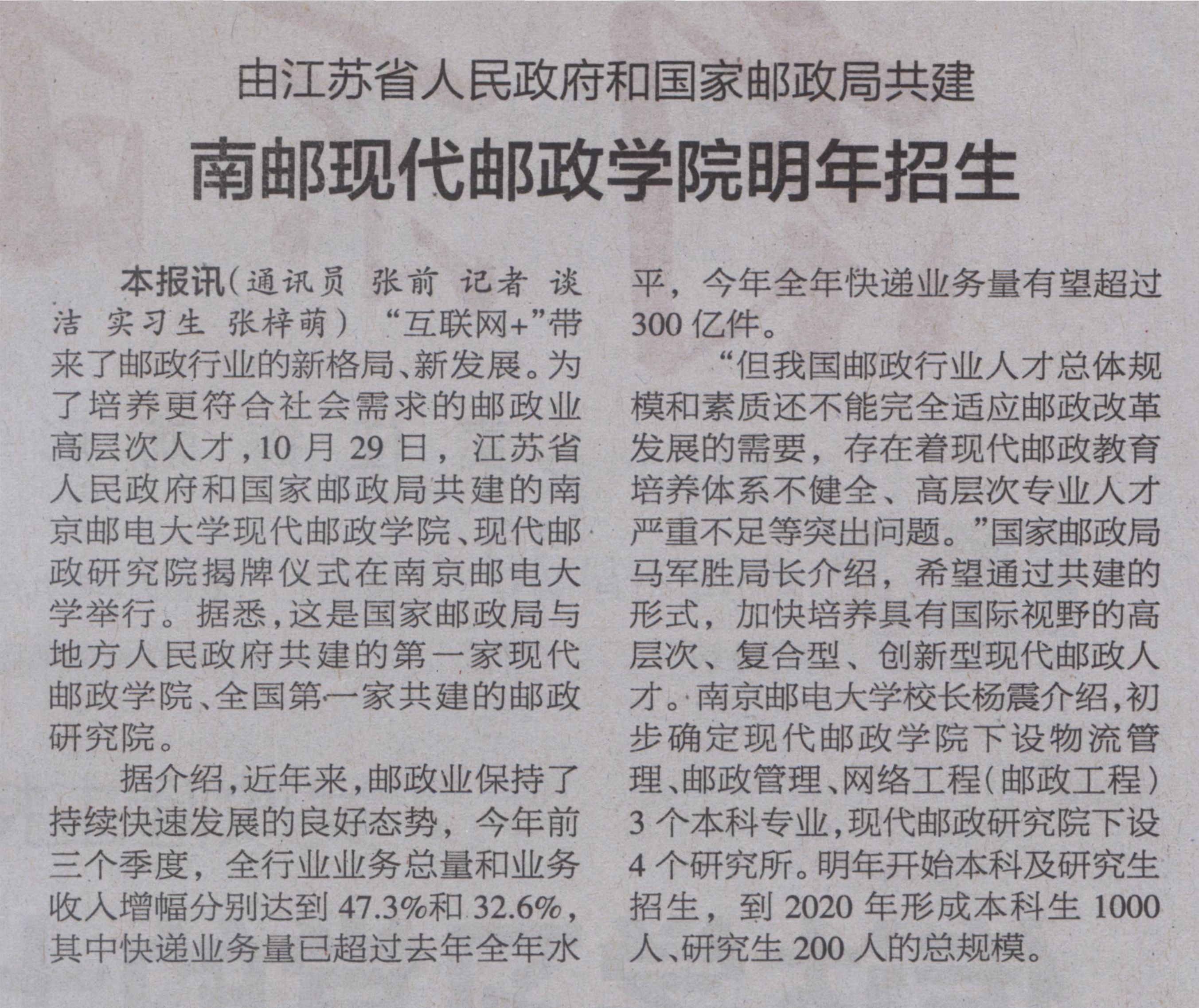 【南京日報(bào)】南郵現(xiàn)代郵政學(xué)院明年招生