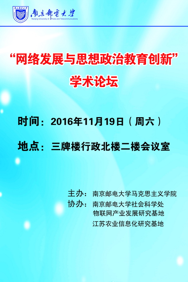 為深入探討網(wǎng)絡(luò)發(fā)展對思想政治教育的影響,南京郵電大學(xué)馬克思主義學(xué)院、南京郵電大學(xué)社科處、江蘇省高校哲學(xué)社會科學(xué)重點(diǎn)研究基地“物聯(lián)網(wǎng)產(chǎn)業(yè)發(fā)展研究基地”和江蘇省決策咨詢基地“江蘇農(nóng)業(yè)信息化研究基地”聯(lián)合舉辦“網(wǎng)絡(luò)發(fā)展與思想政治教育創(chuàng)新”學(xué)術(shù)論壇,國家教學(xué)名師、“馬工程”首席專家等知名學(xué)者將作論壇主題報(bào)告。