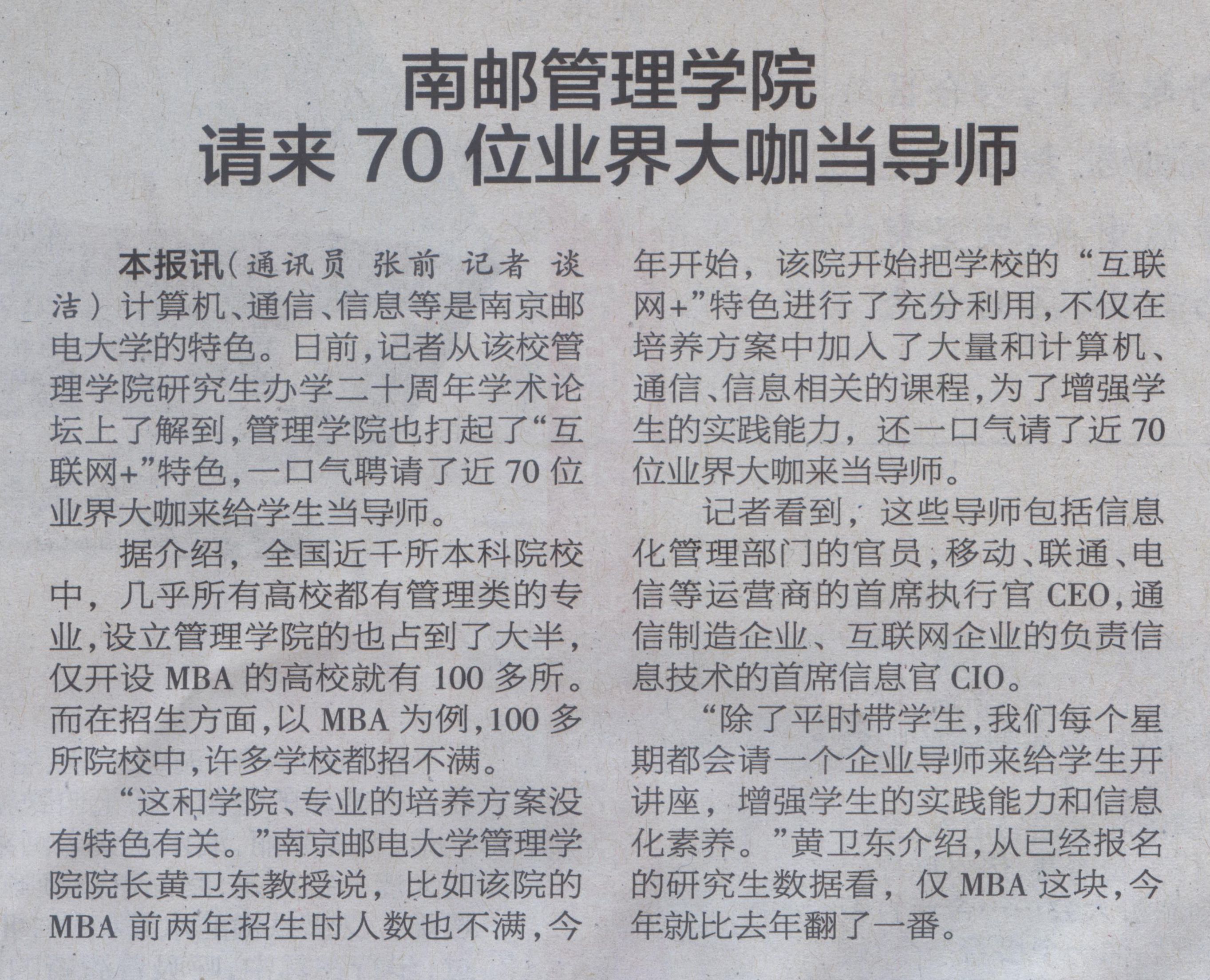 【南京日報】南郵管理學院請來70位業界大咖當導師