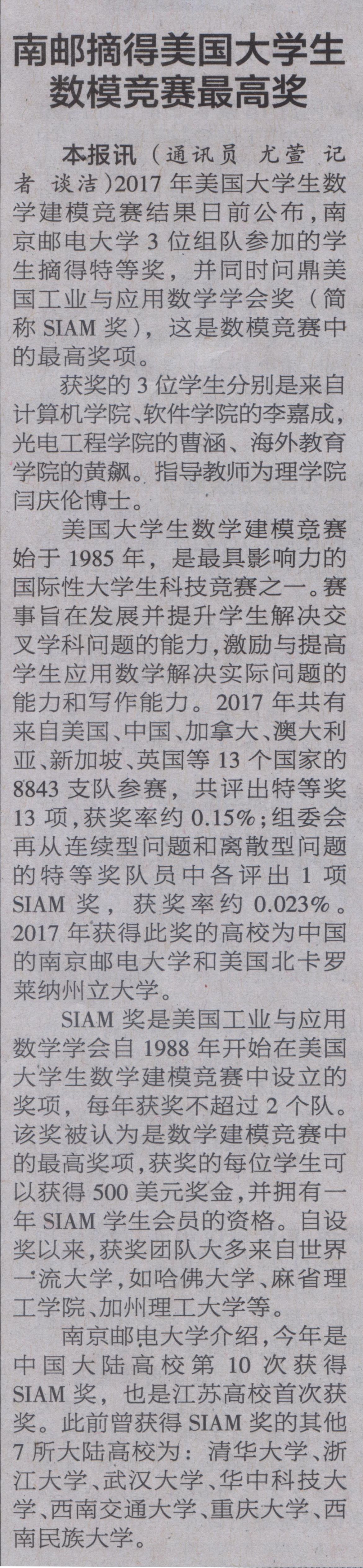 【南京日報】南郵摘得美國大學生數模競賽最高獎