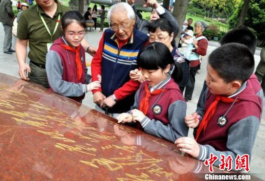 老紅軍與小學生在紅軍廣場朗讀毛澤東的詩詞《七律·長征》。 沈金霞 攝