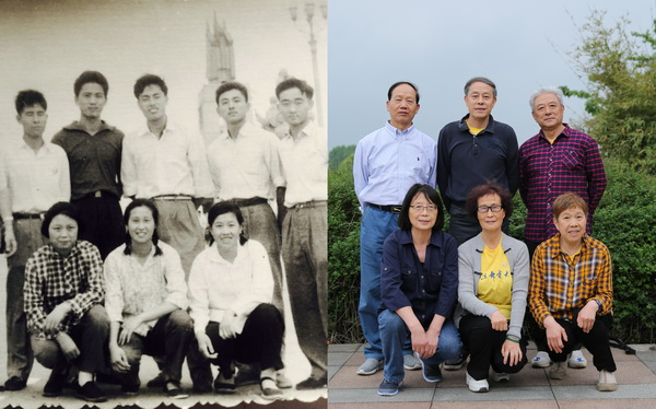 (老照片后排左一為當年的工宣隊員,右一為老師,當年的六位同學本次全部來齊)