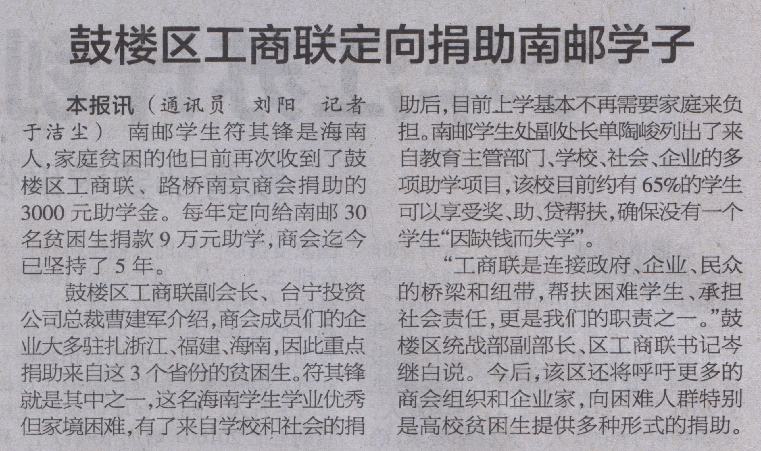 【南京日報】鼓樓區(qū)工商聯(lián)定向捐助南郵學子