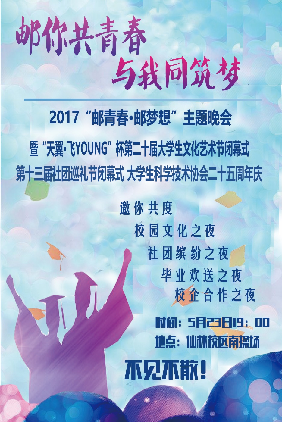 為促進校園文化建設,展示學生青春風采,激發師生愛校情懷,定于2017年5月23日(周二)19:00在仙林校區南操場舉行南京郵電大學2017“郵青春·郵夢想”主題晚會暨“天翼·飛YOUNG”杯第二十屆大學生文化藝術節閉幕式。
