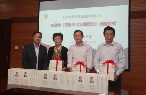 儀式上,余富文總經理代表北京崇學文化發展有限公司向南郵贈書,圖書館、外國語學院、海外教育學院負責人接受了贈書。《習近平談治國理政》收入了習近平總書記在2012年11月15日至2014年6月13日這段時間內的講話、談話、演講、答問、批示、賀信等79篇,分為18個專題。該書全面系統回答了新的時代條件下中國發展的重大理論和現實問題,是國際社會了解當代中國的重要窗口、尋找中國問題答案的一把鑰匙。