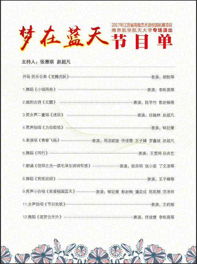 為進一步濃郁校園文化藝術氛圍,2017年江蘇省高雅藝術進校園拓展項目——夢在藍天南京航空航天大學專場演出將于2017年10月12日(周四)19:00在仙林校區大學生活動中心青春劇場舉辦,歡迎廣大師生前來欣賞。