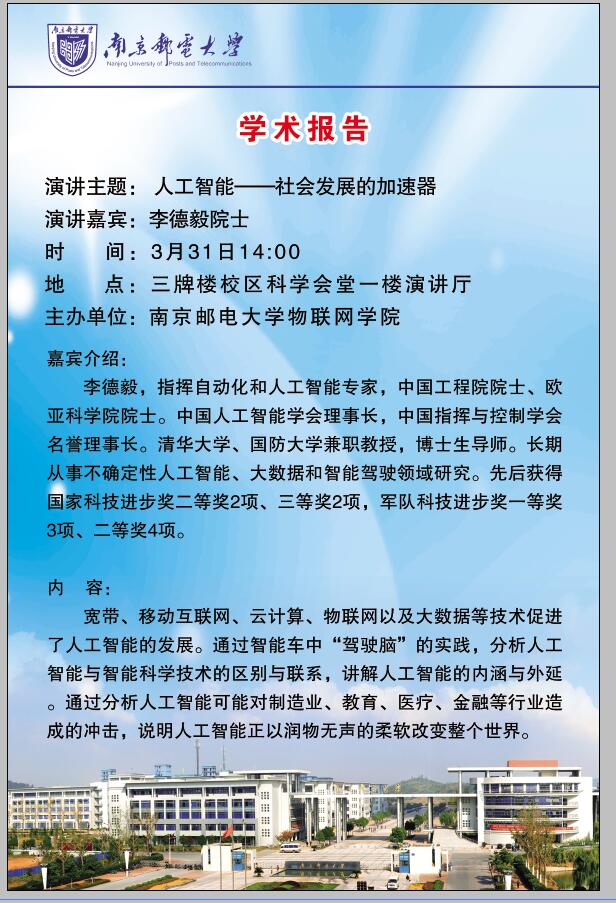 關(guān)于舉辦李德毅院士《人工智能——社會發(fā)展的加速器》主題報告的通知