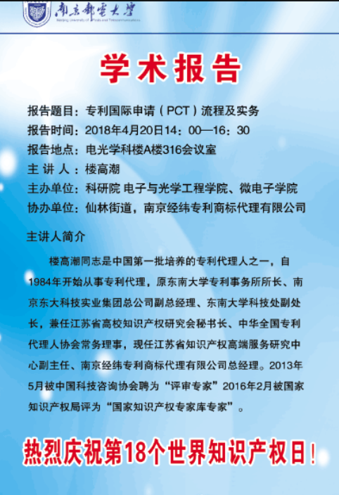 為提高廣大師生對國際專利申請的認(rèn)知度及申請能力,同時為慶祝第18個世界知識產(chǎn)權(quán)日,特舉辦PCT專題講座,歡迎廣大師生積極參加。