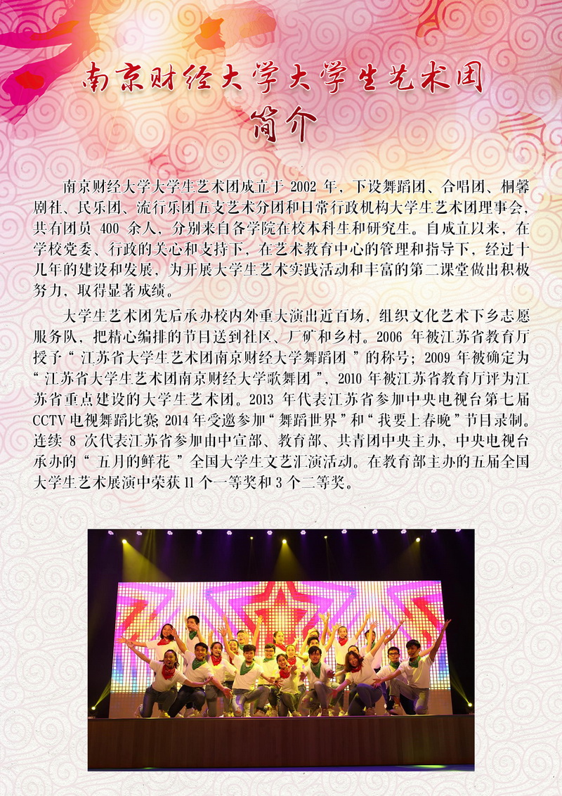 為進(jìn)一步濃郁校園文化藝術(shù)氛圍,2018年江蘇省高雅藝術(shù)進(jìn)校園拓展項(xiàng)目——“陽(yáng)光路上”南京財(cái)經(jīng)大學(xué)大學(xué)生藝術(shù)團(tuán)專場(chǎng)演出將于2018年5月13日(周日)19:00在三牌樓校區(qū)華禮堂舉辦,歡迎廣大師生前來(lái)欣賞。