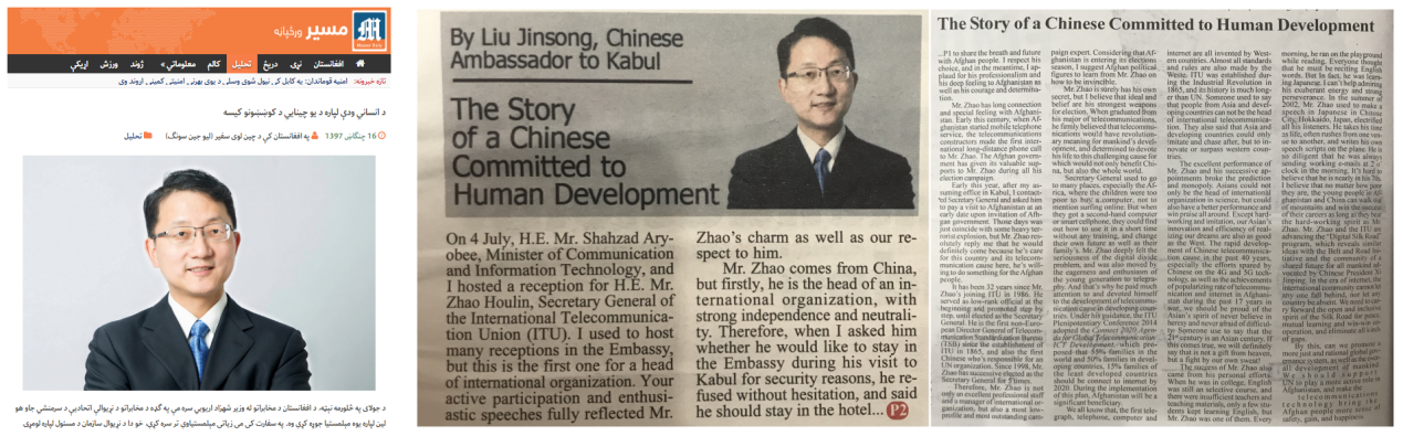 7月7日,中國駐阿富汗大使劉勁松在阿富汗主流報刊《阿富汗時報》(英文)、《馬塞爾日報》(普什圖文)刊發署名文章《講一個中國人致力于人類進步的故事》,介紹我校杰出校友、國際電信聯盟秘書長趙厚麟。中文原文如下: