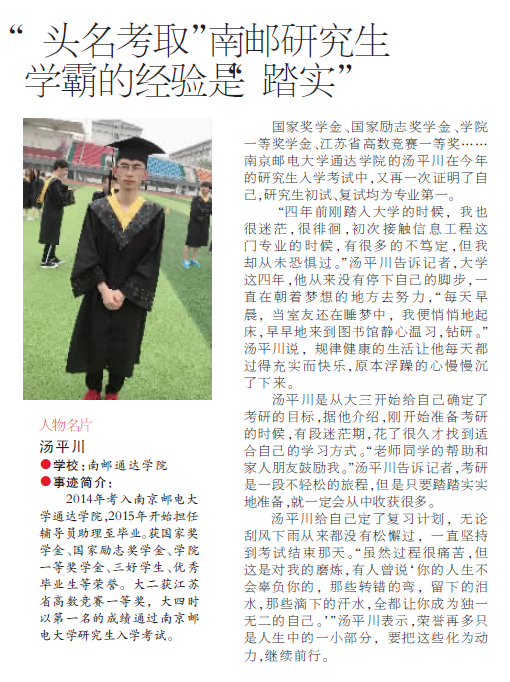 【揚州日報】“頭名考取”南郵研究生 學霸的經驗是“踏實”