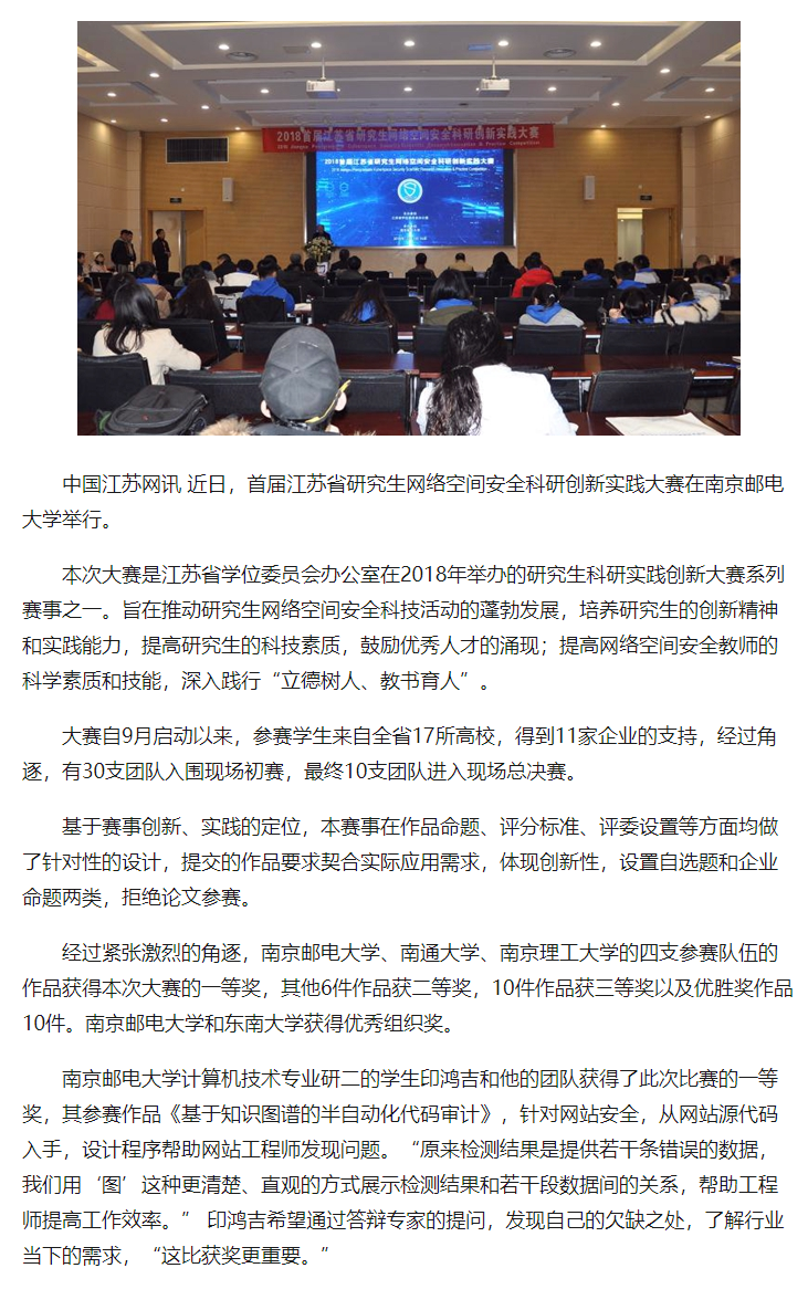 【中國(guó)江蘇網(wǎng)】首屆江蘇省研究生網(wǎng)絡(luò)空間安全科研創(chuàng)新大賽在南郵舉行