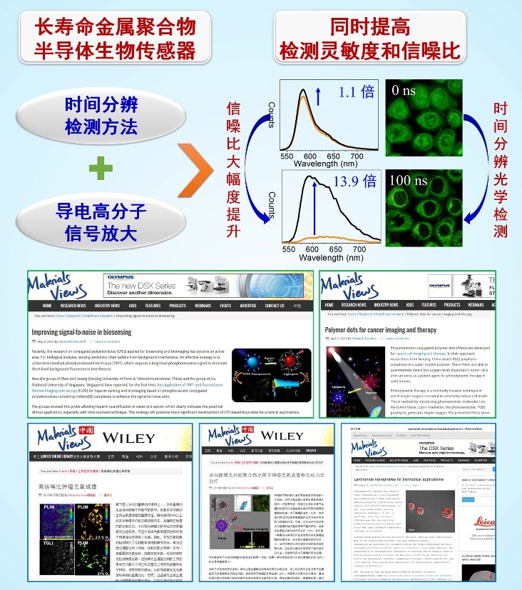 進一步,團隊實現(xiàn)了金屬有機半導體的高靈敏“信息傳感”功能,利用長壽命三重激發(fā)態(tài),通過時間分辨光學技術(shù)提高生物信息傳感信噪比。趙強教授解釋說,比如在用光學傳感器檢測癌細胞時,血液中同時存在的其它熒光生物分子,會對檢測信號產(chǎn)生嚴重干擾。而金屬有機半導體是一種磷光材料,發(fā)光壽命遠遠長于熒光物質(zhì),非常有利于通過時間分辨光學技術(shù),消除“背景干擾信號”,獲得“壽命長”的有效光學信號,從而大大提高檢測靈敏度。成功解決了“生物背景熒光干擾導致檢測信噪比低”這一領(lǐng)域難題。