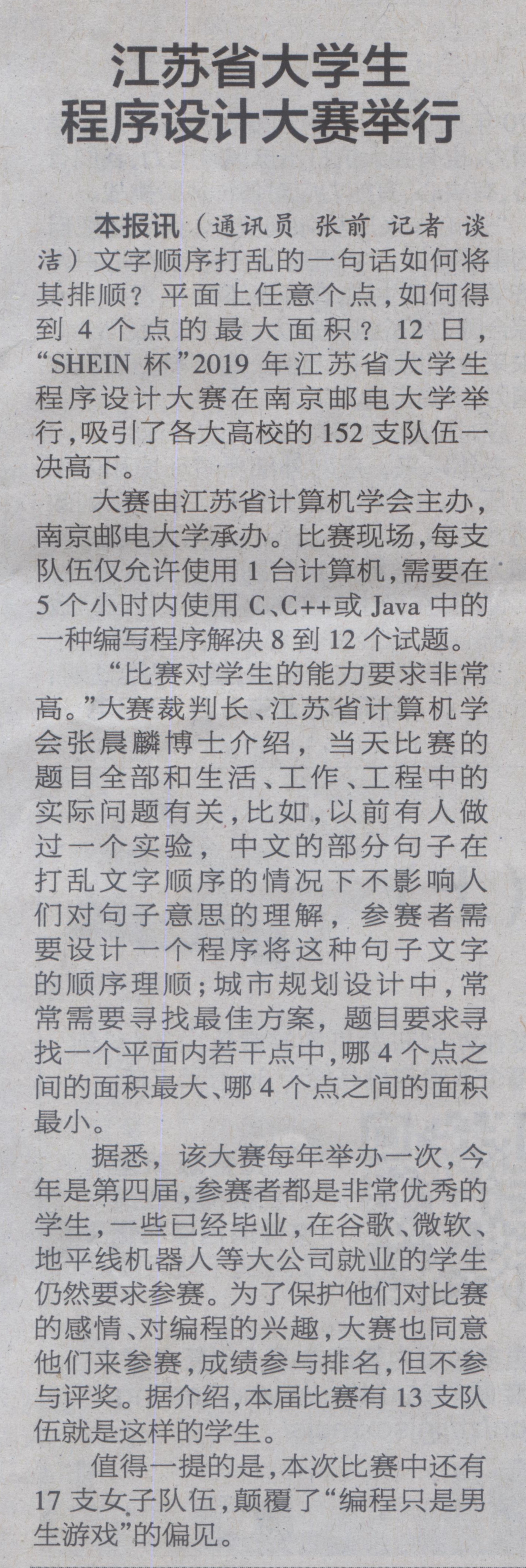 【南京日報】江蘇省大學生程序設計大賽舉行