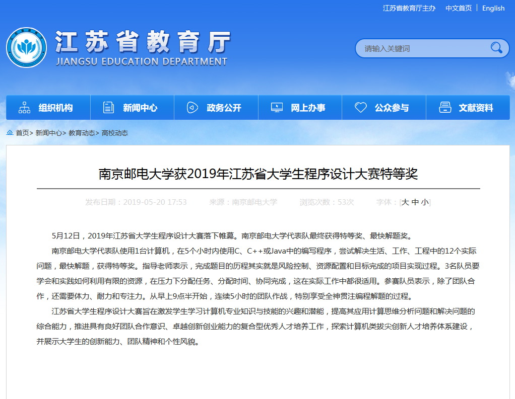 【江蘇教育】南京郵電大學(xué)獲2019年江蘇省大學(xué)生程序設(shè)計(jì)大賽特等獎(jiǎng)