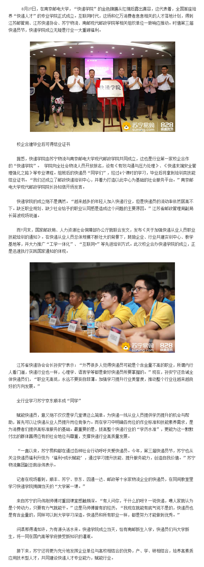 【鳳凰網(wǎng)江蘇】國內(nèi)首個快遞學(xué)院正式成立 蘇寧南郵合辦