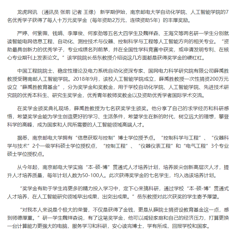 【龍虎網】南京郵電大學院士捐資 獎勵“人工智能”優秀學子人均十萬元