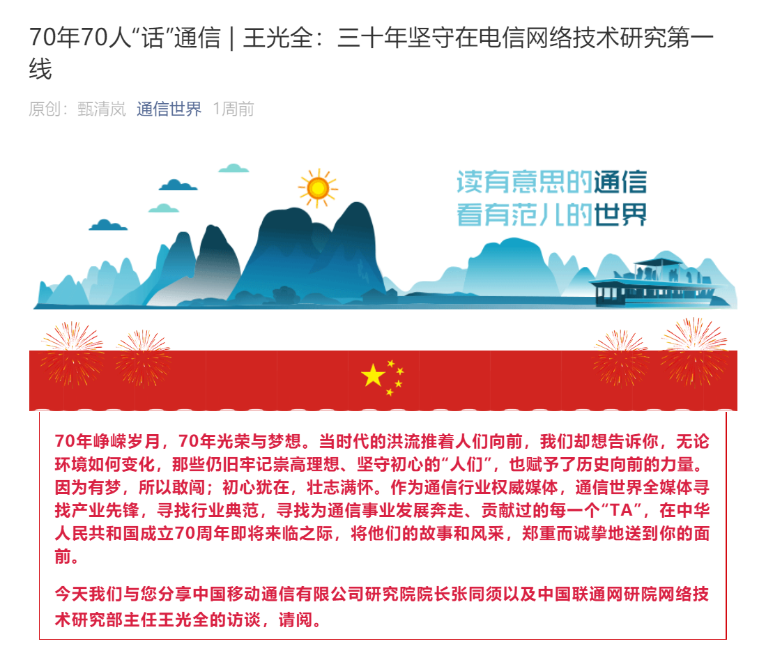【通信世界】70年70人“話”通信|王光全:三十年堅守在電信網絡技術研究第一線