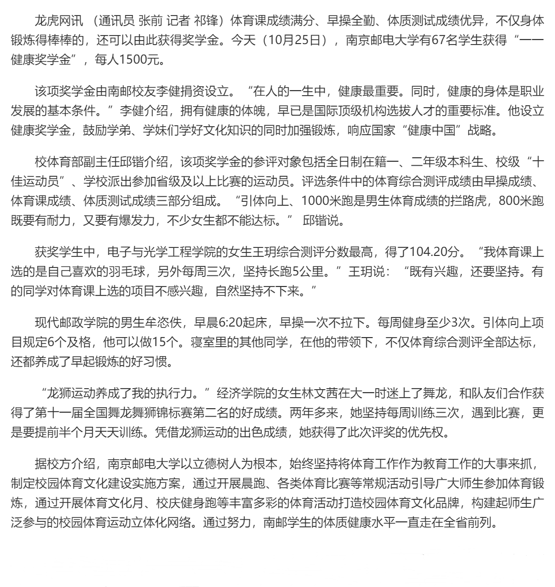 【龍虎網】南郵設立“健康獎學金” 學生鍛煉好身體就有機會拿