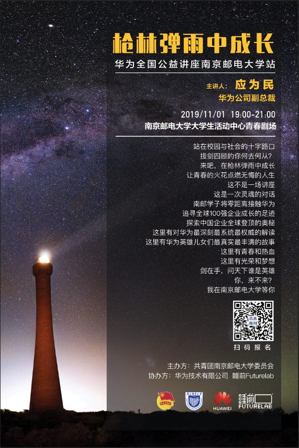 2019年11月1日19:00,“槍林彈雨中成長華為全國巡回公益講座南京郵電大學站”講座將在仙林校區青春劇場舉辦。屆時,活動將進行同步直播。
