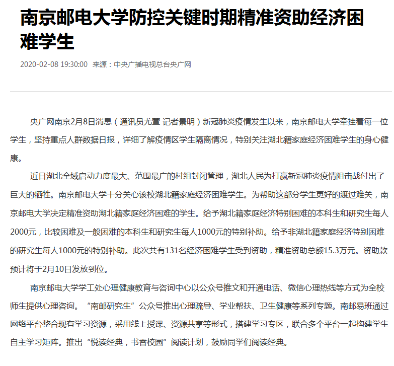 【央廣網】南京郵電大學防控關鍵時期精準資助經濟困難學生