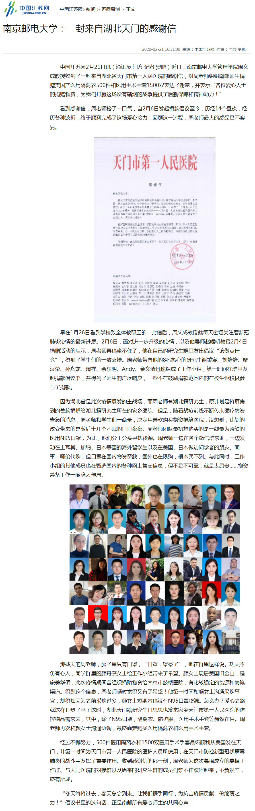 【中國(guó)江蘇網(wǎng)】南京郵電大學(xué):一封來自湖北天門的感謝信