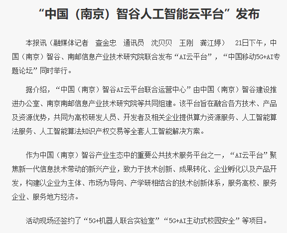 【南京日?qǐng)?bào)】“中國(南京)智谷人工智能云平臺(tái)”發(fā)布