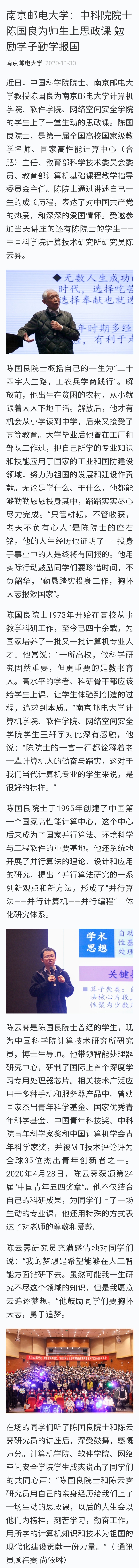 【學習強國】南京郵電大學:中科院院士陳國良為師生上思政課 勉勵學子勤學報國