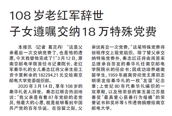 【新華日報】108歲老紅軍辭世 子女遵囑交納18萬特殊黨費