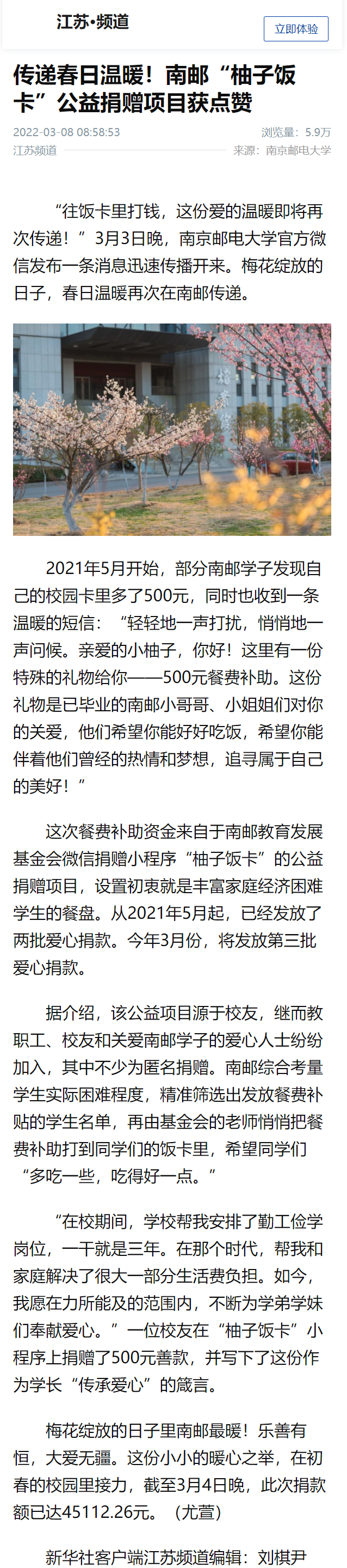 【新華社客戶端】傳遞春日溫暖!南郵“柚子飯卡”公益捐贈項目獲點贊