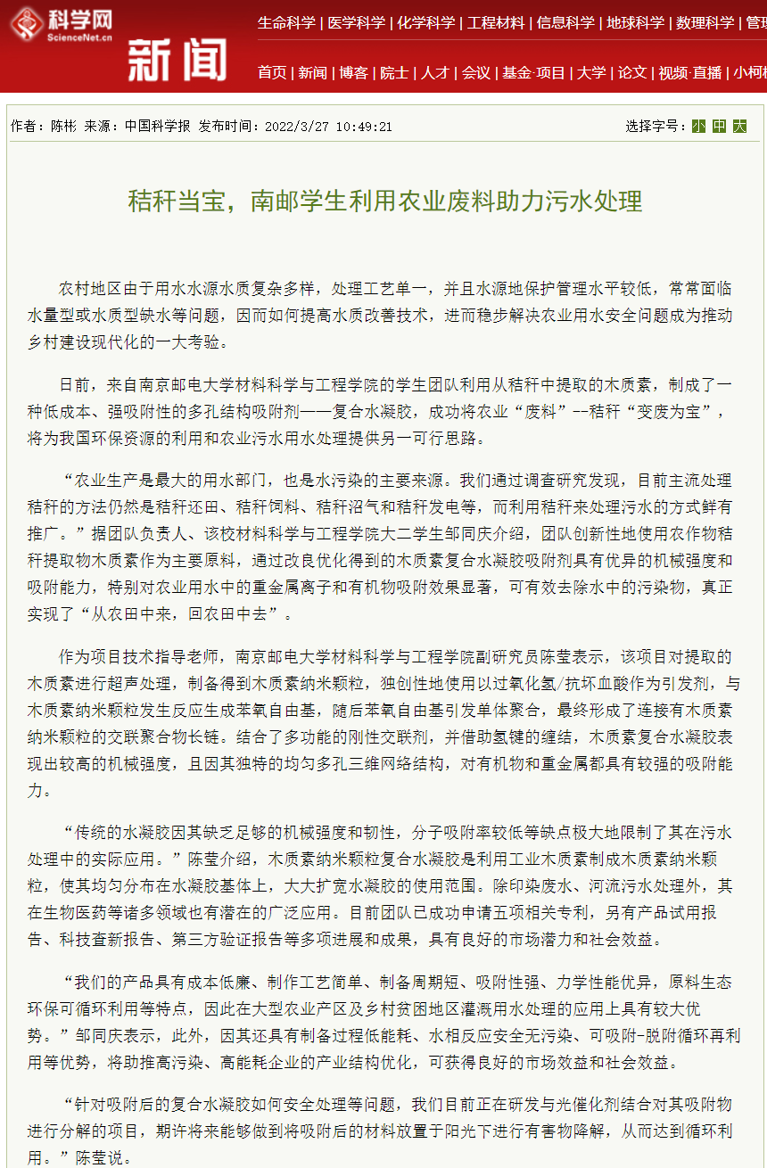 【科學網】秸稈當寶,南郵學生利用農業廢料助力污水處理