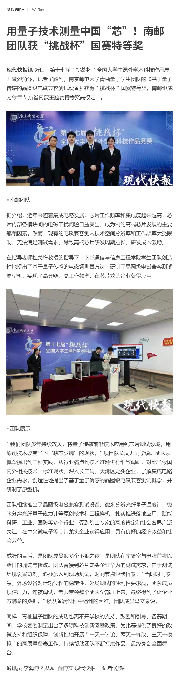 【現代快報全媒體】用量子技術測量中國“芯”!南郵團隊獲“挑戰杯”國賽特等獎