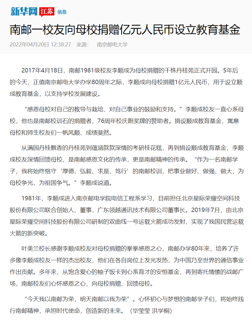【新華網江蘇頻道】南郵一校友向母校捐贈億元人民幣設立教育基金